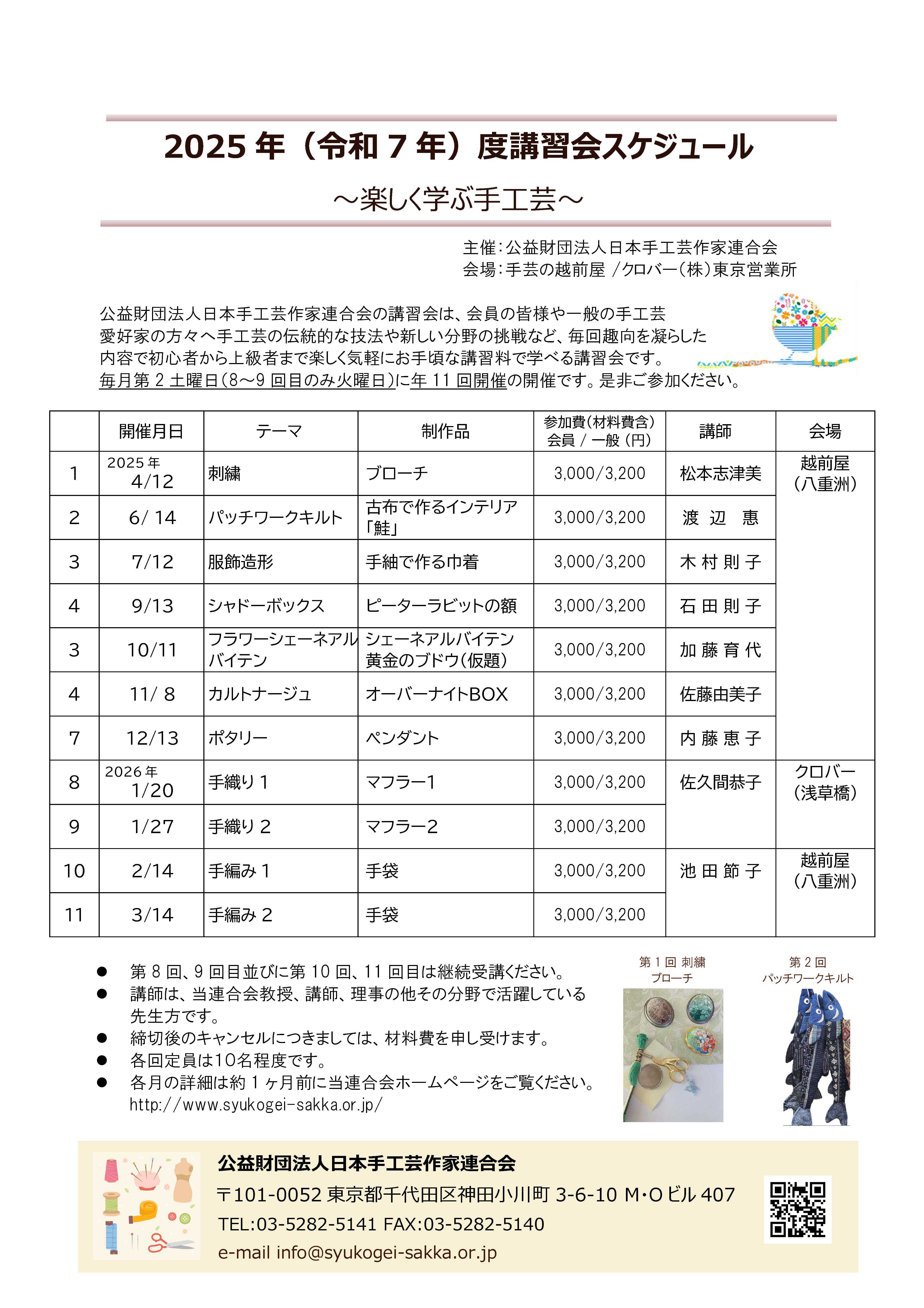 公益財団法人日本手工芸作家連合会の講習会は、会員の皆様や一般の手工芸愛好家の方々へ手工芸の伝統的な技法や新しい分野の挑戦など、毎回趣向を凝らした内容で初心者から上級者まで楽しく気軽にお手頃な料金で学べる講習会です。