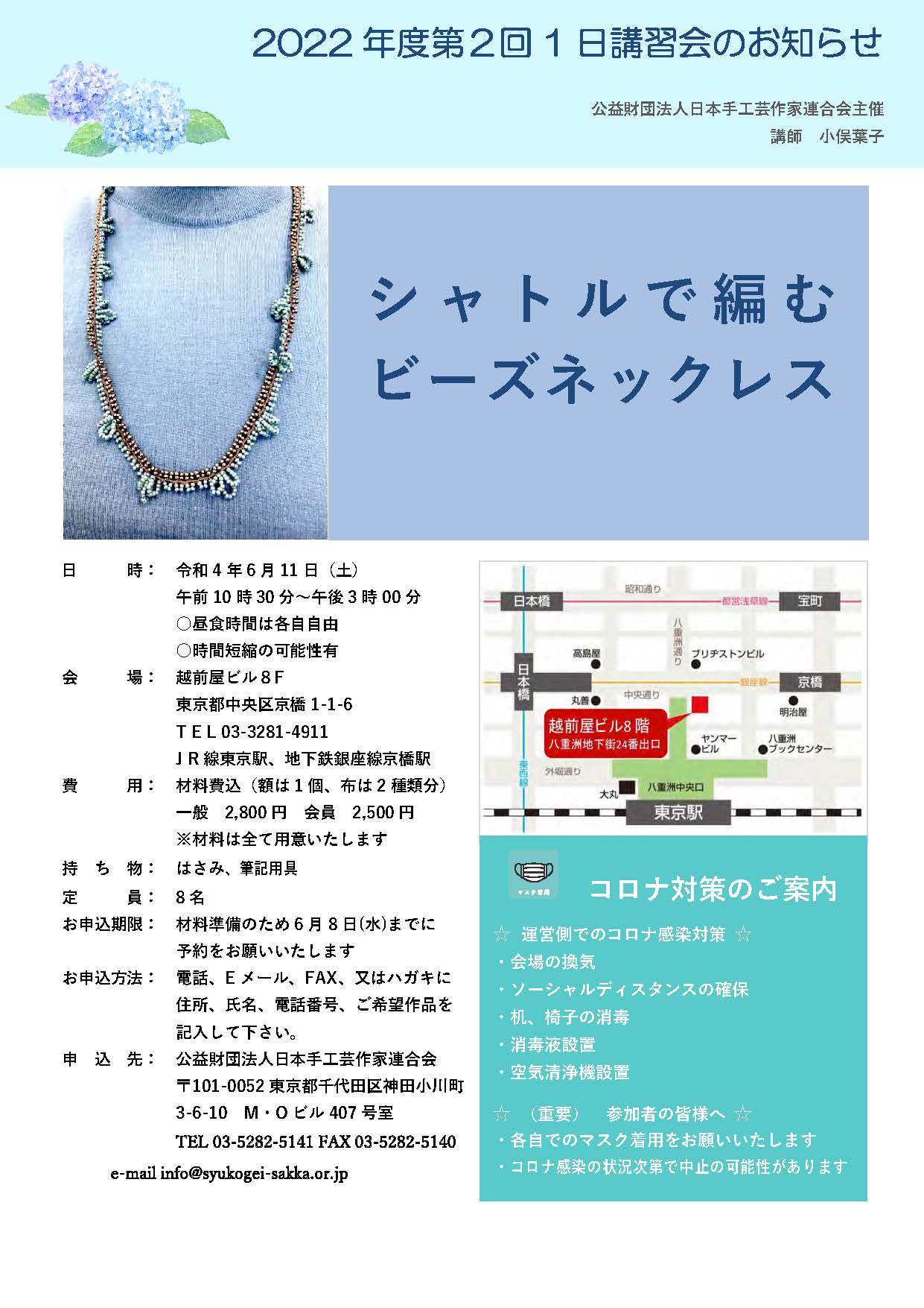 2022年度 第2回1 日講習会 6月11日(土)シャトルで編むビーズネックレス